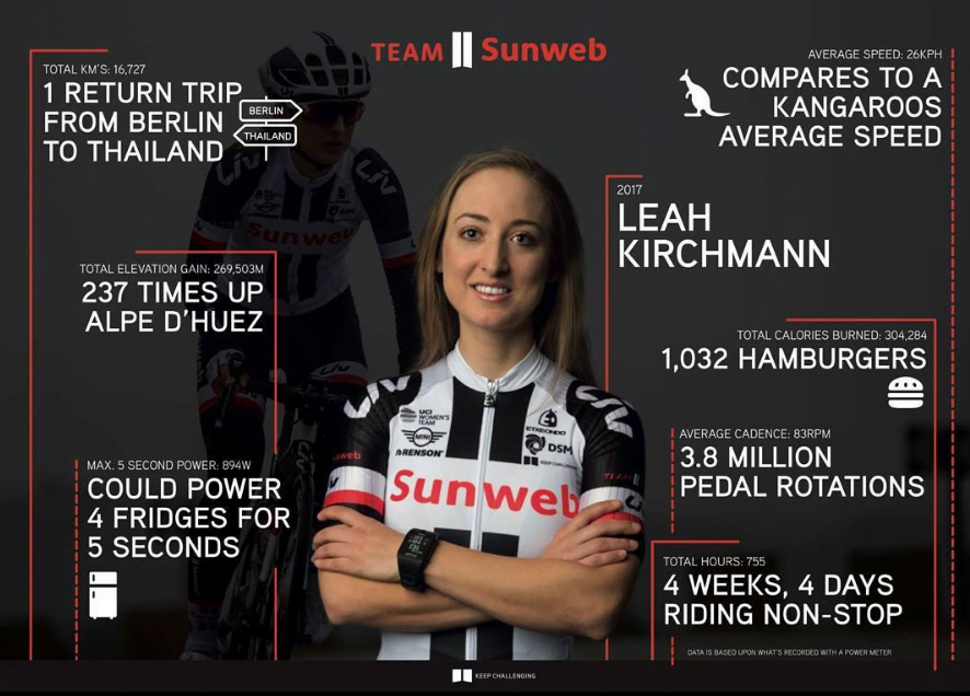 Kirchmann is volop bezig aan de voorbereiding voor het nieuwe seizoen. “Mijn voorbereiding verloopt tot nu toe goed. Ik lastte een kort trainingskamp in, in het zuiden van Californië. Als het weer het toelaat, train ik thuis in Canada. In januari vertrek ik op trainingskamp naar Europa.” Kirchmann houdt van variatie in haar trainingsschema tijdens het off-season. “Ik rijd op de weg, maar ik voeg ook krachttraining toe, cyclocross, mountainbiken, hiking en skiën als er sneeuw ligt.” Ze hoopt er volgend seizoen onmiddellijk te staan. “In 2018 hoop ik opnieuw mijn ploeggenotes te helpen naar veel sterke resultaten. Persoonlijk wil ik mijn sprint verbeteren, daarom focus ik nu vooral op het ontwikkelen van meer kracht en skills.”Team Sunweb
