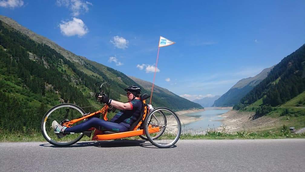 Handbiken én wielrennen”Na mijn amputatie in 2014 heb ik zo’n 2 jaar gerevalideerd in revalidatiecentrum het Leijparc. Tijdens het revalideren heb ik kennis gemaakt met vele sporten, maar handbiken bleek al snel mijn favoriet. In eerste instantie op de aankoppel handbike (een handbike die aan de rolstoel gekoppeld kan worden) en later op de vastframehandbike. Hoewel de eerste rit echt wel even wennen was (mijn armspieren waren nog niet echt ontwikkeld, verder dan 5 km kwam ik niet) vond ik het direct leuk. En elke rit die ik op de handbike maakte, smaakte naar meer. Heerlijk buiten, vrij, genieten van de omgeving!