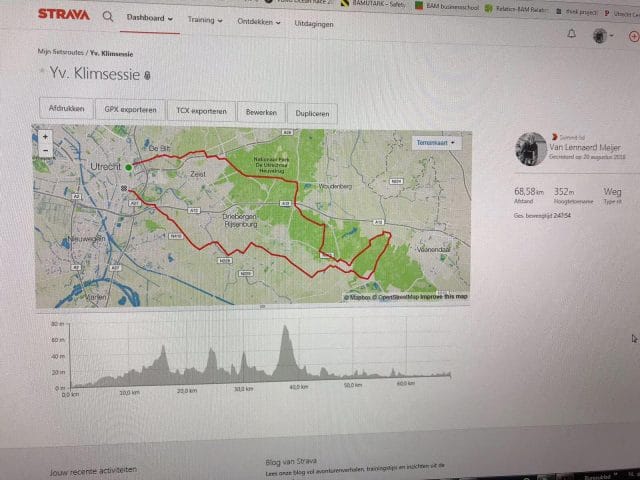 Een paar dagen na het klim-idee, krijg ik onderstaande foto via Whatsapp doorgestuurd met de titel ‘Yv klimsessie’. Gevolgd door het berichtje ’68km, lukt jullie wel toch? 😉 Oja, én 350 hoogtemeters’. Ik kijk naar de foto en het eerste wat me te binnen schiet is dat we gek zijn. Ik fiets pas net en mijn langste rit tot nu toe was een vlakke 43km, zonder stop. Na goed kijken zie ik dat de afstand van ons huis nog verder is en dus komt deze klimsessie voor mij en Stefan op 73km uit. Drieënzeventig kilometer! Dat is best heftig. Maar hoe tof als we dit gewoon gaan doen? Met ook nog 3 klimmetjes, waaronder de Amerongse Berg. Stiekem toch wel ontzettend leuk: let’s do this!