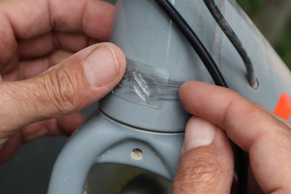 Op de voorbeeldfoto’s zie je o.a. mijn eigen grijze gravelracer, waarvan ik me al 2 jaar voornam iets te doen aan de schurende leidingen. Nu dus veel te laat, maar wel een mooi voorbeeld van hoeveel schade die zandkorreltjes tussen leidingen en lak kunnen aanrichten. Het aluminium is zelfs flink weggesleten. Voor het mooie zou ik daar eigenlijk een likje verf overheen moeten doen voor ik de plakker bevestig, maar ach, het is ook wel weer een mooi aandenken aan alle toffe ritten die we samen al gemaakt hebben 😁.