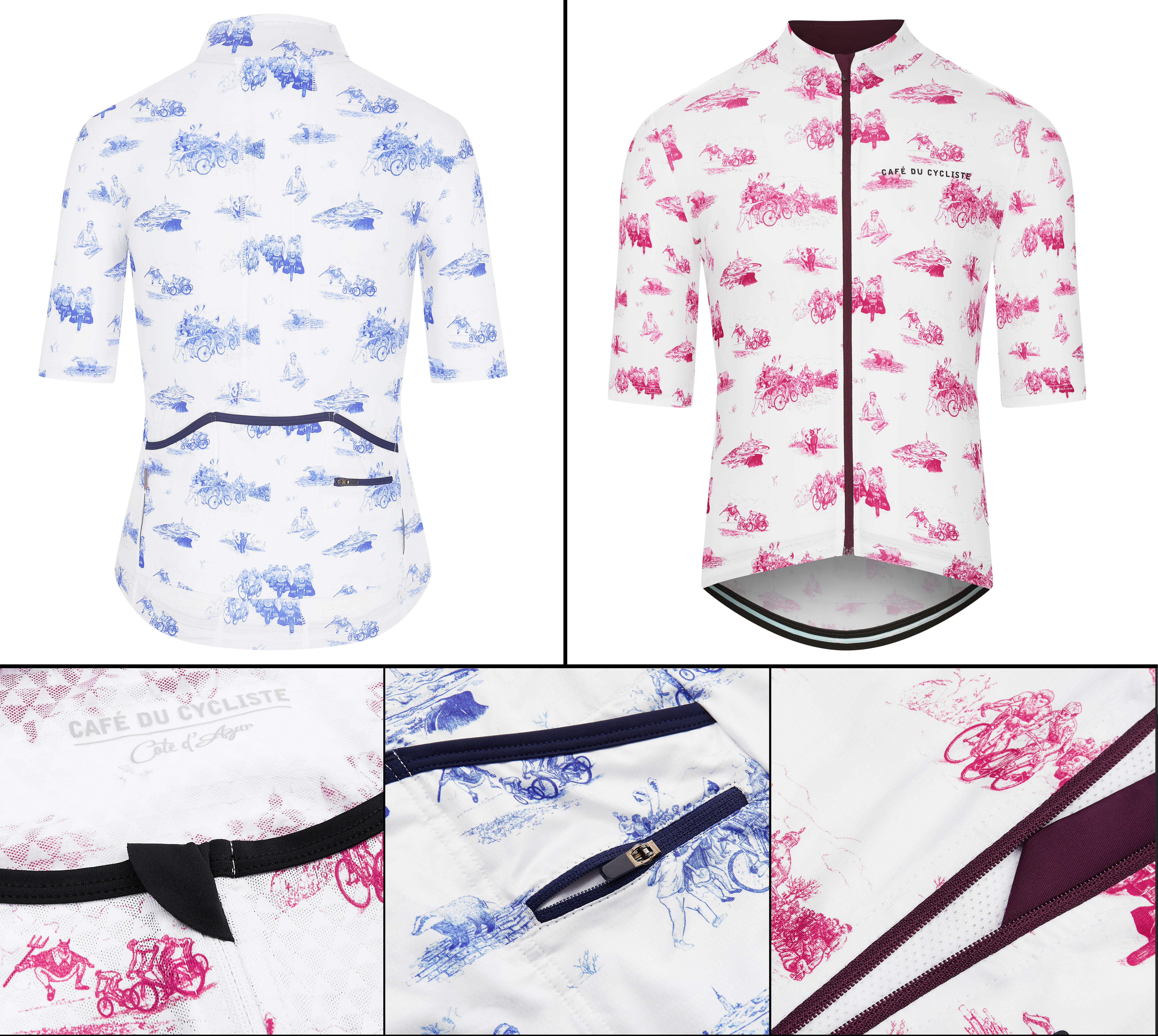 De designs op de jerseys en bibshorts bestaan uit diverse tekeningen, het zijn scènes die iconische verhalen van de Franse wielergeschiedenis vertellen. Denk aan de renners Robic de Geit, Hinault de Das, Fignon en de Professor. De legendarische tourduivel: El Diablo, de klim van de Mont Ventoux en een knipoog naar de kasseien over de grens bij de Muur van Geraardsbergen zijn ook zichtbaar. En tot slot: Anquetil en Poulidor schouder aan schouder op de Puy de Dôme.De ultralichte jerseys hebben 3 achterzakken, een klein zakje met rits en reflecterende details. Ze zijn verkrijgbaar in het roze en blauw, zowel voor mannen als vrouwen. Daarnaast zijn er ook bijpassende baselayers, caps en fietstassen verkrijgbaar.