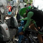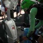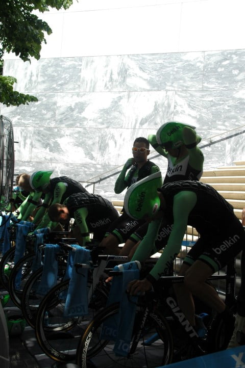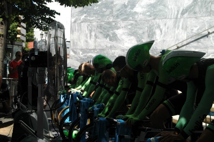 Een opmerkelijk gezicht voor de start van de ploegentijdrit in de Tour de France. Belkin doet nogal wat om de renners koel te houden voordat ze aan de wedstrijd beginnen. De renners gebruiken niet alleen koelvesten, ze worden tijdens het infietsen ook nog eens koel gehouden door enorme blowers.