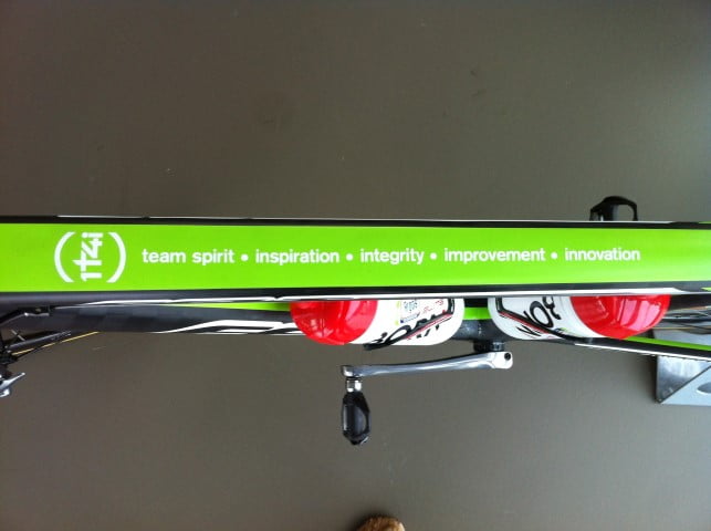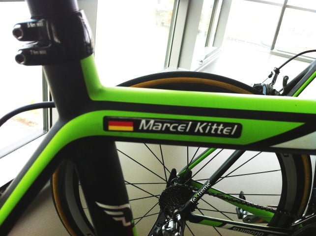 Opmerkelijk is de aanwezigheid van de naam van Mark Cavendish op de fiets van Kittel. De Duitser gebruikt de Pro Vibe ”Mark Cavendish” stuurpen. Deze carbon stuurpen is enkele jaren terug mede ontwikkeld door Britse sprinter. Deze stijve stuurpen is belangrijk voor spurters, gezien de enorme kracht die een in een massaprint op het stuur worden uitgeoefend.