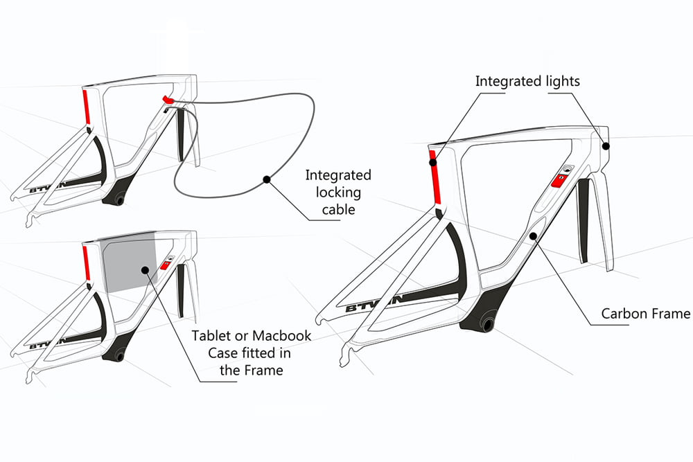 Volkswagen-ontwerper Xavier Lescourret paste een aantal slimmigheden aan zijn geesteskind toe, zo meldt Cycling Weekly. Er is een voor- en achterlicht in het frame geïntegreerd, net als een slot.
