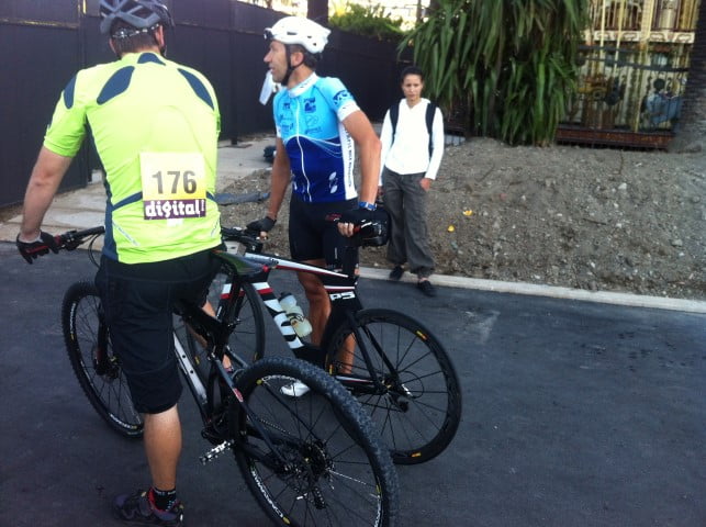Om half negen moet ik me melden bij de jury. De organisatie laat renners in groepen van twintig het startgebied binnenkomen. We blijken nog 35 minuten te moeten wachten voordat we mogen starten. Ik zit in een groep met enkele Britten, Fransen en een Australiër. Stilstaan en wat kletsen is de enige mogelijkheid, want inrijden kan niet in dit kleine gebied. Mike Dunne rijdt als één van de weinigen op een gewone fiets. Hij start na mij. ”When you see me, you’re in trouble”, grapt hij. Na 20 minuten wachten voel ik een nieuw probleem aankomen: plassen. Er is in de startzone geen toilet te bekennen, net zo min als een boom of een muurtje. Een minpunt voor de organisatie. Uiteindelijk misbruik ik maar een lege bidon om mijn blaas te legen. De bidon gaat in een afvalzak.
