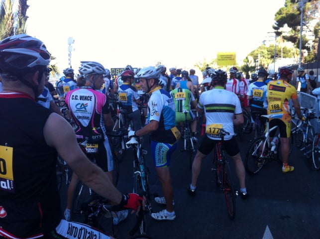 In de startzone zie ik verschillende type fietsen. Ik tel enkele Cervélo P5’s en P3’s, een Bianchi Pico Crono, maar ook enkele oudere type tijdritfietsen. Ze worden bereden door afgetrainde atleten, maar soms ook door renners met het nodige overgewicht. Gelukkig zijn extra kilo’s op het parcours in Nice geen handicap.