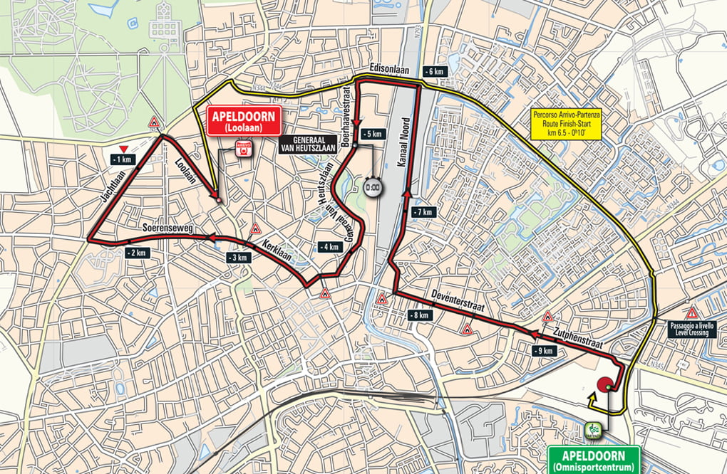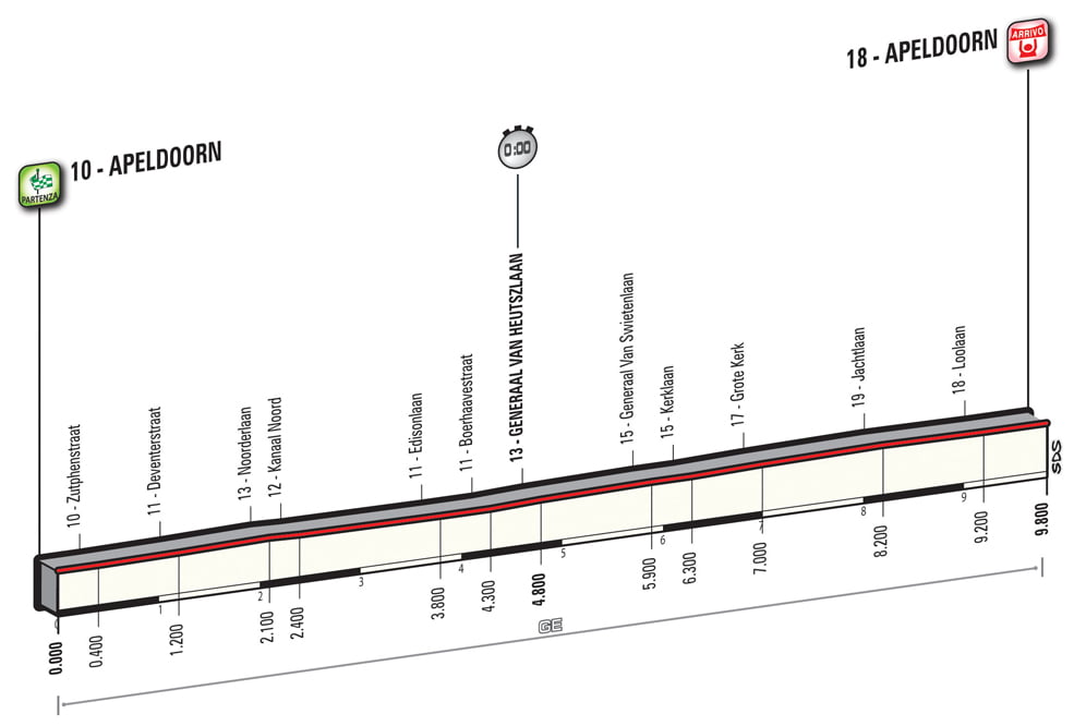 De Giro opent met een 9.8 kilometer lange tijdrit. De tijdrit start in het Omnisportcentrum en gaat via de Generaal van Heutszlaan naar de Loolaan, waar de finishstreep is getrokken. De eerste renner gaat om 13:45 uur van start, de laatste om 17:45 uur.