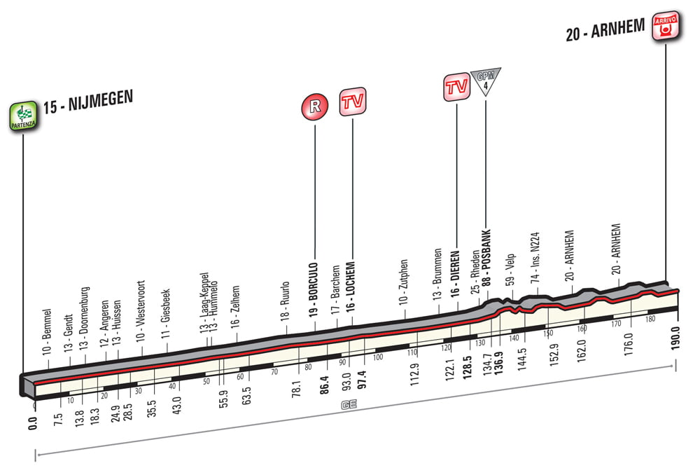 Zondag 8 mei, Nijmegen-ArnhemDe derde etappe start in Nijmegen, gaat door de Achterhoek en finisht in Arnhem. De 190 kilometer lange rit doet na 136.9 kilometer de Posbank aan. In Arnhem zijn er vervolgens twee plaatselijke rondes van veertien kilometer, waarna tussen 16:50 en 17:25 de finish wordt verwacht.