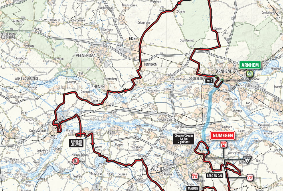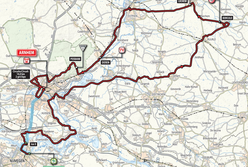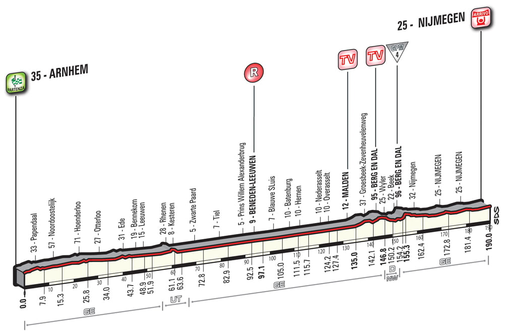 Zaterdag 7 mei, Arnhem-NijmegenMet misschien wel Tom Dumoulin in de roze leiderstrui vertrekt het peloton om 12:40 uur vanuit Arnhem. Via een klein uitstapje naar Utrecht en Duitsland finisht men tussen 17:00 en 17:25 uur aan de Oranjesingel in Nijmegen. Misschien is het leuk om in Berg en Dal een kijkje te nemen, want daar vindt een bergsprint plaats. In Nijmegen zie je de renners twee keer, aangezien ze twee rondes van 8.6 kilometer rijden.