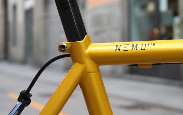 Een klassieke look met hedendaags competitiegewicht en technische details: van de taps toelopende balhoofdbuis voor verhoogde stijfheid en sterkte, tot de Columbus Futura monocoque carbon vork (hetzij standaard of in 12 mm steekas versie); de subtiele aerodynamische vorm van de staande achtervork (check de Columbus Air staande achtervorken van de originele Cinelli Laser in 1981!), de triple butted 44mm downtube en de flat mount aansluiting. De Nemo Tig Disc-liggende achtervorken worden tijdens de fabricage speciaal voorgevormd door Columbus om de schijfremklauw op te vangen. De Tig-lastechniek verhoogt de algehele frame-stijfheid en maakt een groot aantal op maat gemaakte geometrieën mogelijk. Een los frame weegt  inclusief voorvork 1850 gram. XS, S, M, L, XL, XXL, rond de 1850 (velg) en 2000 euro (disc). http://cinelli.it/en/prodotti/nemo-tig-en/