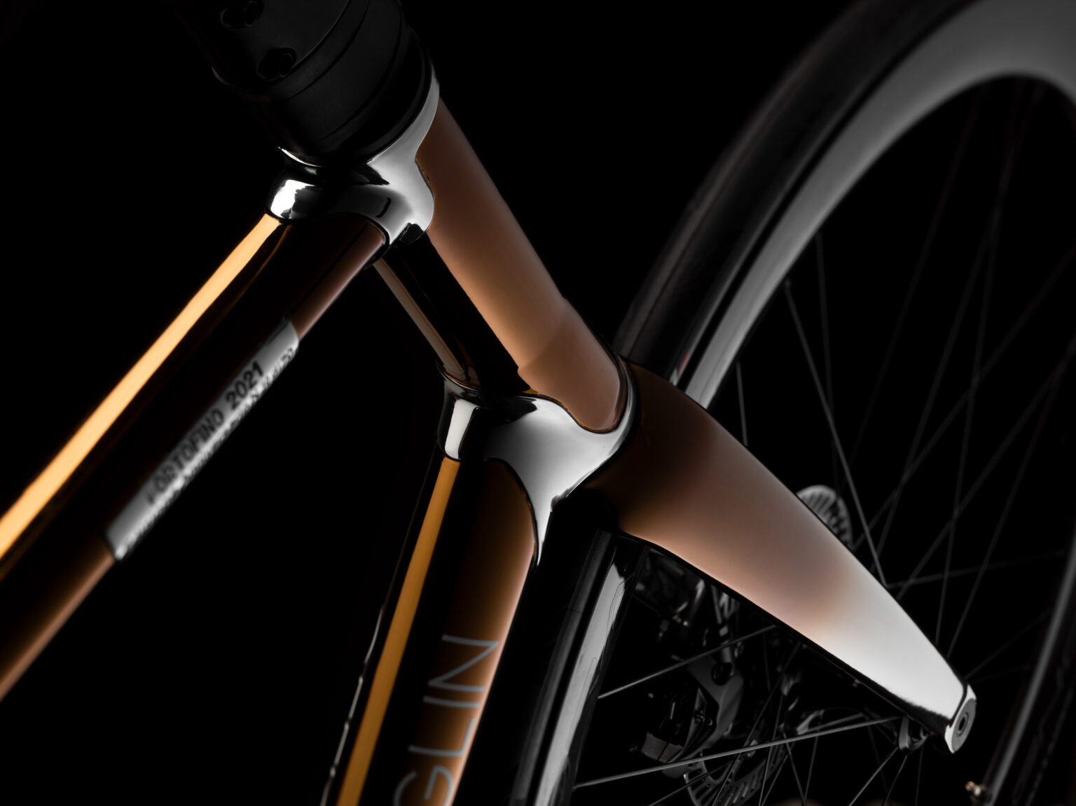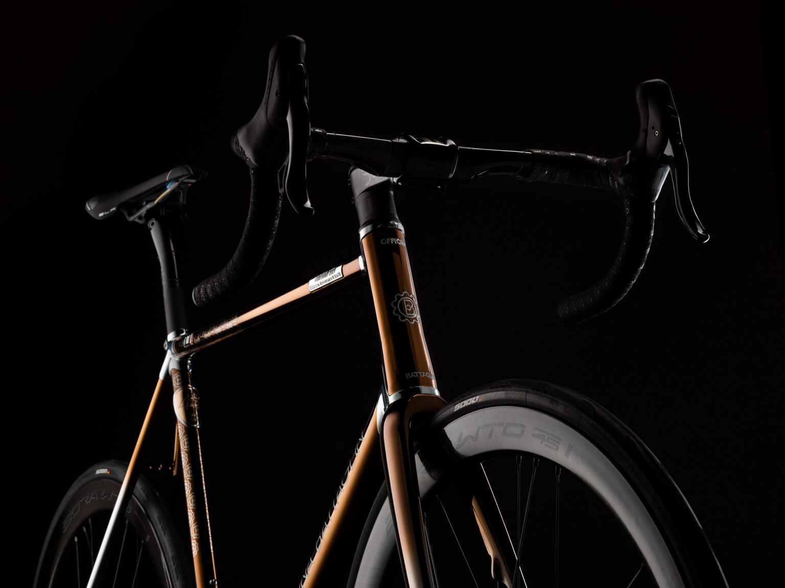 De Portofino Evo Anniversario van Officina Battaglin heeft voor dit jaar namelijk een geïntegreerde cockpit met volledig verborgen kabelgeleiding in combinatie met oversized lugs. Het frame is van oversized Columbus Spirit HSS-buizen met taps toelopende balhoofdbuis. En daarin draait een speciale full carbon vork, volledig gefabriceerd in Italië. De rem- en derailleurkabels lopen door de speciale D-vormige stuurbuis. Eigenlijk net als bij een carbon racer.