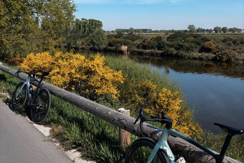 We rijden onder de luwte van de bomen richting Beernem, waar we op het jaagpad langs het kanaal Gent-Brugge rijden. We fietsen op kaarsrechte stroken asfalt, geflankeerd door de natuur die prachtig in bloei staat, en langs kabbelend water. We kunnen hier heerlijk tempo maken en rijden enigszins beschut tegen de wind.