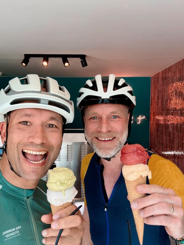 Zwetend onder een parasolletje genieten we van ambachtelijk gemaakt ijs, met melk van de koeien hier uit de streek. Het leven is goed hier, helemaal op de fiets, concluderen we. En ook na drie rondjes hebben we het gevoel dat er nog veel meer te zien en te ontdekken valt in deze toch wat onderbelichte fietsregio. In de laatste kilometers zing ik nog een keer voluit: ‘West-Vlaanderen boven!’