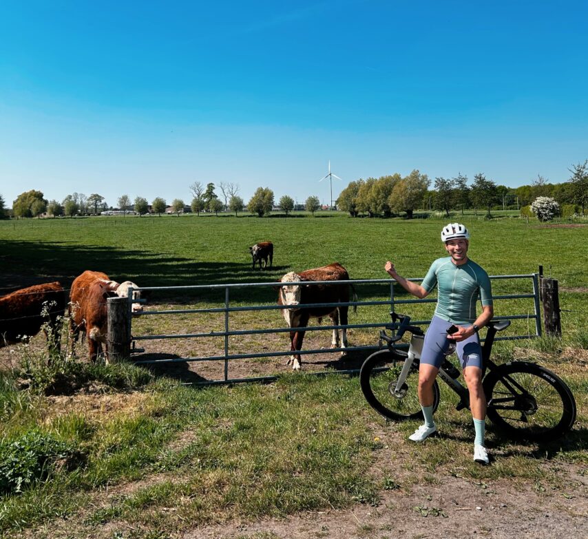 De laatste 20 kilometer vormt nog een mooi groen visitekaartje van het Brugse Ommeland. Het is hier een prachtige lappendeken van kavels met boerderijtjes, en ik neem even de tijd om te stoppen bij een groep grazende, maar nieuwsgierige koeien. Ze sjokken naar ons toe en bekijken ons van een meter afstand. Wanneer we onze route vervolgen, komen we nog door een mooi bos en verlopen de laatste kilometers over boerenwegen. Links en rechts zien we boerderijen met stallen die meestal gepaard gaan met zo’n typisch chaotisch erf. Voldaan en met een grote glimlach sluiten we dit rondje af met een koude cola op het terras van ons vakantiehuis in Lichtervelde.