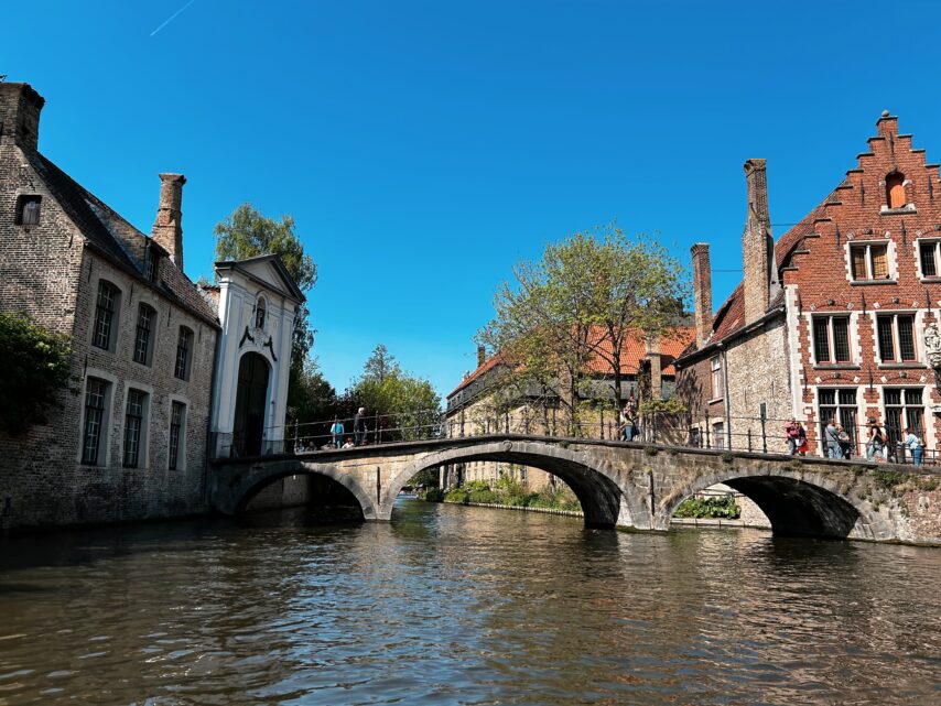 We passeren het dorpje Sint-Joris, waar we pal langs het plaatselijke café rijden, waarvan de uitbater druk bezig is zijn Jupilerbiervoorraad vanuit de vrachtwagen aan te vullen. En jawel, de eerste pintjes worden tegen het middaguur al verorberd op het terras. Met het kanaal aan de rechterkant rijden we verder, over veelal goed begaanbare fietspaden, en passeren de plaats Beernem. We zien een drukbezette jachthaven waar je als fietser even kunt stoppen bij ’t Boothuis voor een espresso met een wafel.