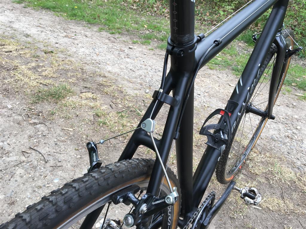 Niks Gravel, het is een crosser. Een uurtje of twee lekker onverhard trappen. Prima. Zo’n ouderwetse. Zelfs met licht schokkende voorvork bij hard remmen. Er passen trouwens ook met gemak 35 mm banden in de fiets, en sommige 38 mm modellen -die met glad profiel- kunnen ook. De Sinergy stuurt lekker. Even zoeken in de bochten, insturen, beetje remmen en dan weer aangaan. Maar ja, er valt natuurlijk niet zo heel veel te remmen. Het is vooral ‘bij ’remmen. En ja, er komen klappen door, maar je gaat automatisch wat staan in het terrein. Beetje remmen? Ja. Als je schijfremmen gewend bent dan is dit natuurlijk ‘afzien’. Maar ach, als je op bekend terrein blijft en geen ‘dikke’ afdalingen doet remmen die Shimano remmen ‘gewoon’ goed.