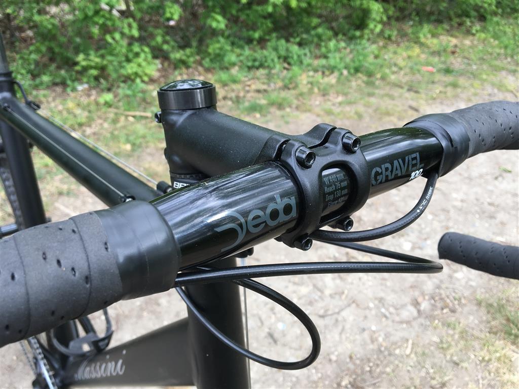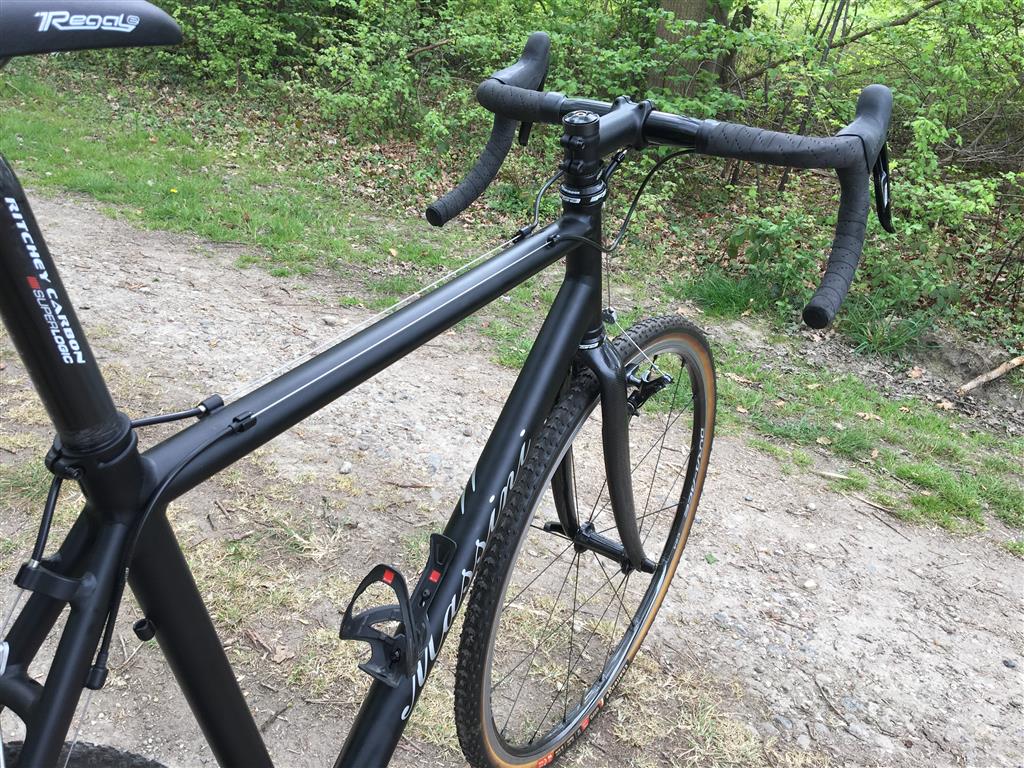 Nu is dat heel persoonlijk, maar we kennen toch echt nog veel fietsers die een oude racer in de schuur hebben hangen. En het mooie van zo’n alu ‘cross’ frame is dat eigenlijk gewoon alles past wat je nog hebt. Een oude Ultegra 9-speed zou ook passen -al zou je dan wel een andere ‘top pull’ voorderailleur moeten kopen. Maar aangezien ‘iedereen’ op schijfremmen overstapt kun je ook een nieuw groepje kopen… Voor ongeveer 350 euro heb je al een SRAM Apex 1 en voor 500 euro een SRAM Rival 1 X groep bijvoorbeeld. Deze fiets heeft een ‘42’ voor en 11/36 achter, gebruikte Shimano CX remmen, Shimano DuraAce C24 wielen met Challenge Grifo 33 mm banden -juist, een stel wielen uit de schuur!- SPD pedalen en Ritchey WCS zadelpen, San Marco Regal zadel. Nieuw is het ongeveer 75 euro kostende Deda Gravel stuur. In totaal was ik aan nieuwe delen zo’n 225 euro kwijt. Om tot een complete crosser te komen moest er dus wel wat spullen uit de schuur gehaald worden. Ik moet er dan wel bij zeggen dat een 1 X groep zonder ‘disc’ en gewone wielen niet heel veel meer opleveren (of kosten). Goed. 8,15 kilo zonder pedalen.