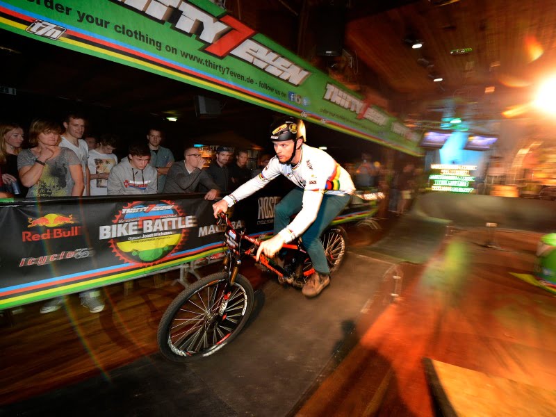 Wat doet die fiets daar op de dansvloer? Het is Joost Wichman, wereldkampioen 4-cross. Een DJ, drummer, danseressen en een enthousiast publiek. Wichman organiseerde in dancing de Radstake, een bikebattle. Het blijft fietsen, maar dan anders: