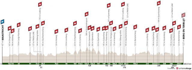 Zondagochtend om 10:35 uur wordt op het Vrijthof in Maastricht het startsein gegeven. Een zware dag met maar liefst 35 hellingen staat de renners dan te wachten. De ‘beginlus’ is nog makkelijk en telt niet de allerzwaarste beklimmingen. Na de eerste passage van de Cauberg en de 2,5 kilometer verderop liggende finish breekt de tweede lus aan met heuvels als de Geulhemmerberg, Loorberg en Camerig. Na het Drielandenpunt in Vaals keren de renners weer terug richting Valkenburg, waar eerst nog linksaf geslagen wordt om via de Sibbergrubbe en Daalhemmerweg af te dalen naar de voet van de Cauberg.