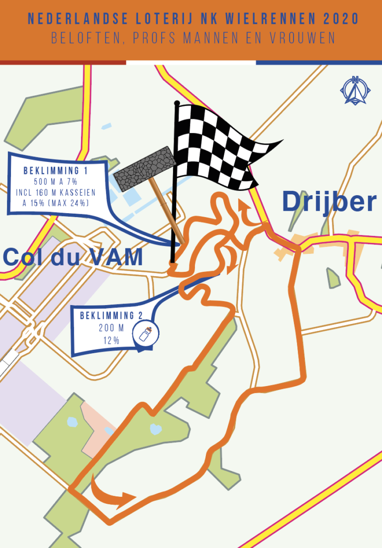 – Zondag 23 augustus: Mannen (start: 13.00 uur, finish ± 17.00 uur), 197 kilometer De VAM-berg dus, ook wel bekend als Col du VAM. De voormalige vuilnisbelt van de Vuil Afvoer Maatschappij (VAM) bij Wijster is omgetoverd tot een ware col. De top van de Col du VAM ligt op 46 meter hoogte, de gemiddelde klim stijgt gemiddeld 10 procent maar heeft steilere stukken tot 14,8 procent. De klim bestaat voor 150 meter uit kasseien. Kortom: pittig! De mannen moeten 27 keer het rondje van 7,3 kilometer afleggen. Dat betekent dus ook 27 keer de beklimming van de VAM-berg…
