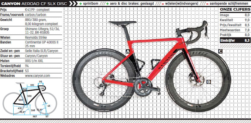 Ik heb de Canyon Aeroad CF SLX Disc meegekregen. Een lust voor het oog. Hij ziet er strak en stoer uit. Een vette fiets die met zijn felrode kleur extra opvalt. De hoge velgen maken hem een geweldenaar om te zien. Op zich is er aan het uiterlijk van de Aeroad Disc niet heel veel veranderd vergeleken met de ‘gewone’ Aeroad. Wel grappig om te merken dat ik al helemaal gewend ben om schijfremmen op een wegfiets te zien. Natuurlijk is er in het frame veel veranderd. De krachten die vrijkomen bij schijfremmen zijn heel anders dan bij traditionele remmen. Daar moeten het frame en de vork op worden aangepast. De lijnen zijn strak en het achterwiel sluit mooi aan op de zitbuis. Het frame bevat veel rechte lijnen. De buizen zijn aan de voorzijde rond en aan de achterzijde veelal plat. Ik vind hem mooi om te zien. De kabels lopen netjes binnendoor zoals we dat van Canyon gewend zijn. De aero zadelpen zit op een fraaie manier vast. Net voor de pen zit een systeem mooi vlak weggewerkt. De schijfremmen zijn flat mount bevestigd aan het frame. De bidonhouders kun je op verschillende plaatsen monteren zodat je altijd de beste positie hebt, of je nu met één of twee bidons wilt rijden. Ook de patten waar de wielen door middel van een steekas vastzitten ogen sierlijk en snel. Het kapje op het balhoofd is leuk gedaan. De Canyon heeft meteen veel bekijks. Onder deelnemers aan The Ride zijn veel lezers van Fiets en geregeld komt dan ook de vraag of dit mijn nieuwe testfiets is. Iedereen is het erover eens dat het een prachtig exemplaar is.