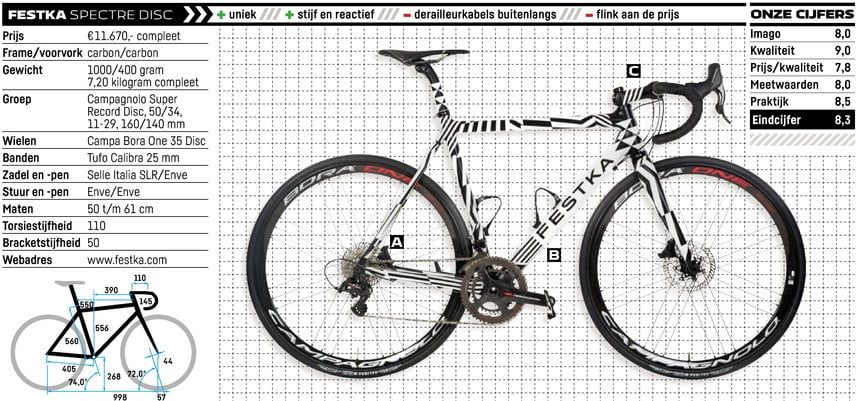 De Spectre Disc is de topracefiets van Festka, dus ik ben daarom ook extra benieuwd hoe hij rijdt. Het frame is afgemonteerd met de Campagnolo Super Record H11 Disc-groepset. Het zou mooi zijn als Campagnolo met deze groep weer aansluiting vindt bij concurrent Shimano. Hij ziet er in ieder geval strak uit. De schijf in het voorwiel heeft een diameter van 160 millimeter, in het achterwiel zit een disc van 140 millimeter. Een combinatie die je steeds vaker ziet. Het meeste remvermogen zit aan de voorkant en een grotere schijf heeft daarop een positieve invloed. Zo worden de krachten beter verdeeld. De remklauwen zien er eenvoudig uit. Het carbon crankstel vind ik echt prachtig. De Campagnolo Bora One draadwielen zijn erg herkenbaar door hun spaakpatroon. Het Italiaanse onderdelenmerk heeft ze opnieuw ontwikkeld om de krachten van de schrijfremmen op te kunnen vangen. Zo komt het dat het bekende spaakpatroon nu ook in het voorwiel te vinden is. Het is een mooi setje wielen dat net onder de 1500 gram weegt. Leuk ook dat er Tufo-banden om liggen. Dit vrij onbekende merk komt uit Tsjechië en staat goed aangeschreven. Stuur, stuurpen en zadelpen zijn van Enve. De meegespoten onderdelen maken de fiets nog meer tot een geheel. Het zadel is de Selle Italia Carbonio. De bidonhouders zijn van het gerenommeerde Duitse bedrijf Tune: erg mooi en superlicht. Het balhoofd met het opschrift ‘Born in the Black Forest, built to enjoy nature’ is van dezelfde fabrikant. Een leuk verborgen detail. De fiets oogt erg chique. Jammer dat de schakelkabels buitenlangs lopen, hoewel het wel soepel schakelt. Ook de manier waarop de remkabel met tiewraps aan de liggende achtervork is bevestigd, vind ik een minpuntje.