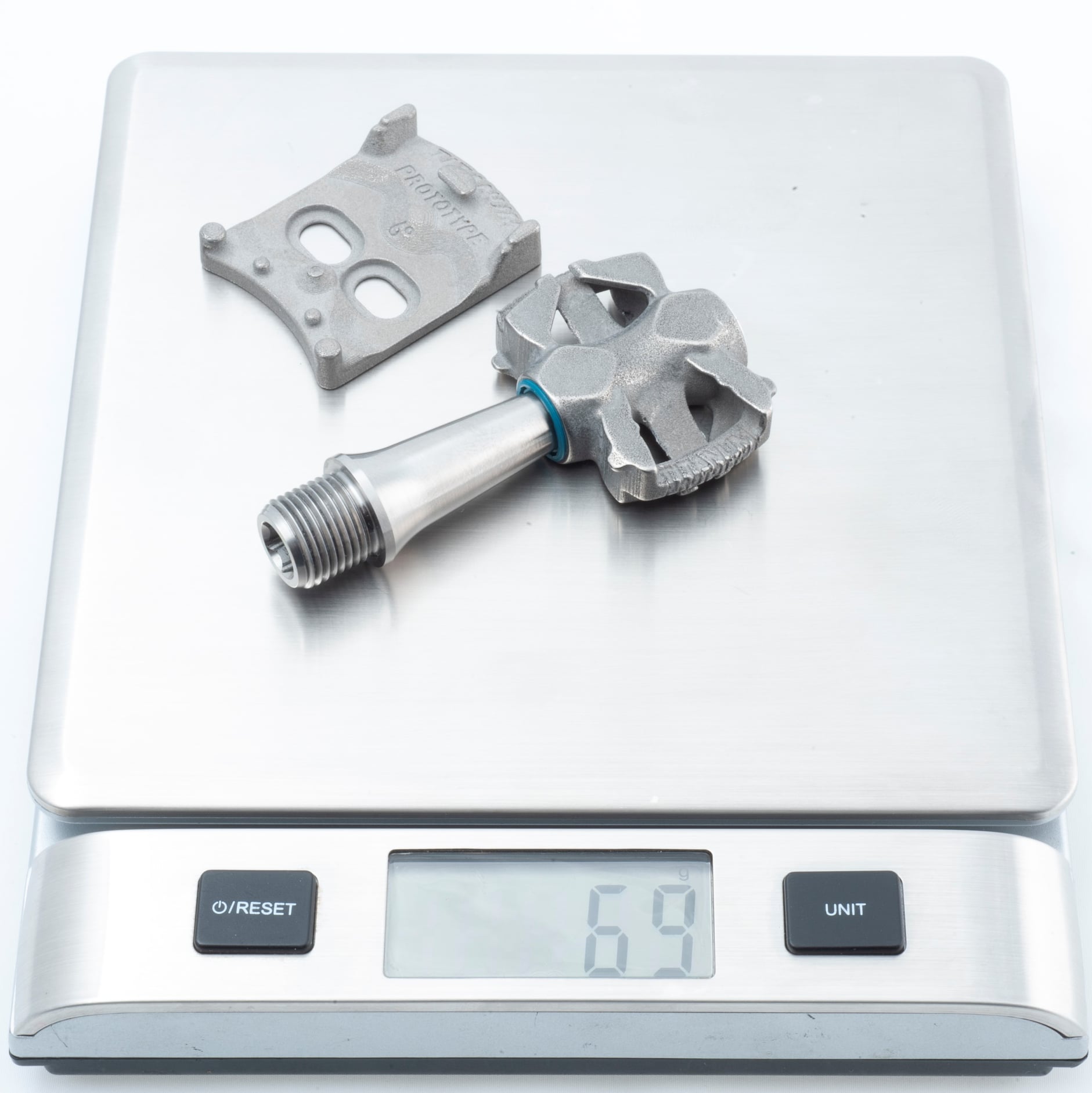Een setje weegt inclusief schoenplaatjes nog geen 130 gram. Ter vergelijking: een set Dura Ace-pedalen zonder bijbehorende schoenplaatjes klokt ruim 100 gram extra op de weegschaal. Rondom de smalle stalen, of titanium as (er komen twee opties beschikbaar) worden een naaldlager en kogellager gemonteerd. Hier overheen draait een titanium 3D geprinte body. Inklikken kan aan beide kanten. Slimmigheidje: Het pedaal werkt zowel met kleine schoenplaatjes voor MTB-schoenen net als voor raceschoenen. Hiervoor gebruikt Wert een 4-punts speedplay passing.