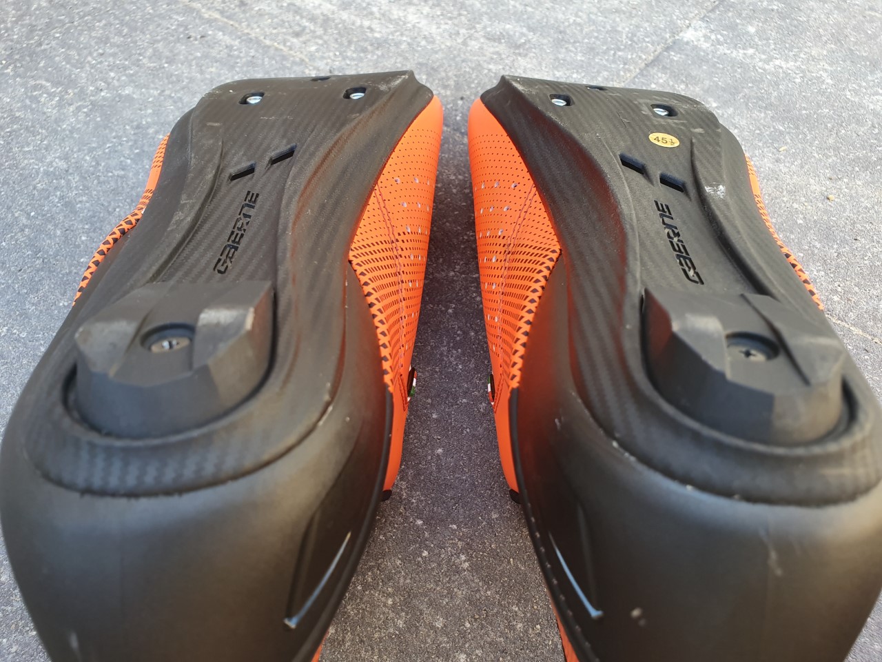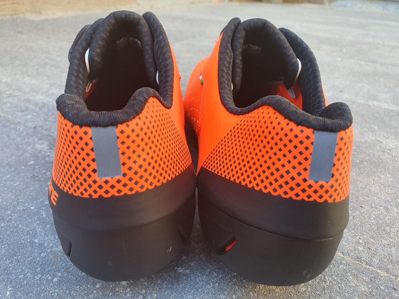 Al rijdend zijn de oranje sloffen goed voor de moraal. Af en toe staar ik naar mezelf in een ruit en kijk ik tevreden naar de mooie schoenen. Qua looks zijn ze echt hartstikke prima en gezien de reacties van mede-weggebruikers zijn het echte eyecatchers, en dat voor schoenen die je met een beetje goed speurwerk voor maar iets meer dan €100 online kunt bestellen… De kunststofzool is lekker stijf; weinig mis mee. Ook aan ventilatie geen gebrek, want zowel op de buitenzool als op de zijkanten heeft de schoen voldoende ventilatiemogelijkheden en dat merk je wel.