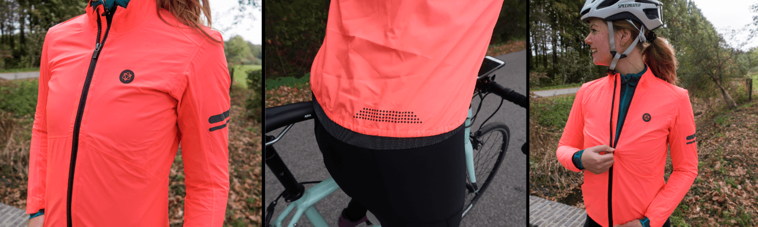 Het jack zit comfortabel, je hebt voldoende bewegingsruimte, terwijl deze toch aansluit op het lichaam. Vooral ook fijn dat zowel de voor als achterkant echt iets langer zijn, zodat het regenjack volledig over je onderkleding valt en deze dus onmogelijk nat worden. Leuk detail: de mouwen zijn ‘voorgevormd’, waardoor deze van nature in een fietspositie staan. Het regenjack is waterdicht, ook de naden zijn volledig getapete én er is een waterdichte rits waardoor je ook echt droog blijft. Enige nadeel is dat je het wel snel warm krijgt, soms iets te warm. Maar door de dunne stof kan je ‘m verrassend klein opvouwen en zo in de achterzak bewaren.