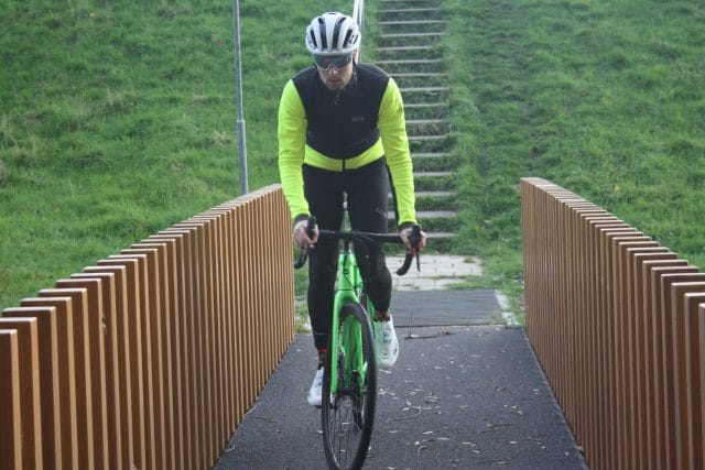 Geen gefriemel in je nek, maar juist een ‘losse’ kraag. Ideaal! Bij het aandoen merk ik direct dat er een elastische band zit bij mijn taille. Het zorgt ervoor dat ik wat moeite moet doen met het aandoen van de jas (dat ligt niet aan mijn gewicht, hoop ik), maar eenmaal ‘in’ de jas voel ik dat de tailleband voor een fijne pasvorm zorgt. De jas zit erg lekker, heeft geen vervelende plooien en voelt niet warm of zwaar aan. Verder ontdek ik meerdere ritssluitingen. Zo zitten er ter hoogte van mijn ribben twee sluitingen en ook bij de mouwuiteinden. Het idee erachter is dat als de lichaamstemperatuur iets te hoog is opgelopen, je door simpelweg het openritsen voor verkoeling zorgt. De windstopper voelt comfortabel aan. Soms trek je een jas aan waarbij je na een paar uur fietsen de kraag voelt kriebelen in je nek, irritant! GORE heeft daar iets op verzonnen en heeft de kraag losser gemaakt met ruwe voering voor extra grip. Wat valt er verder op? De Pro Jacket heeft drie achterzakken, zachte kinbescherming, een langere achterkant (met grippers) om je te beschermen tegen opspattend water en/of vuil en heel veel reflecterende elementen. Foto’s maken ging door de reflectoren daarom niet zo makkelijk, zoals hieronder te zien..