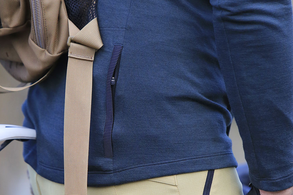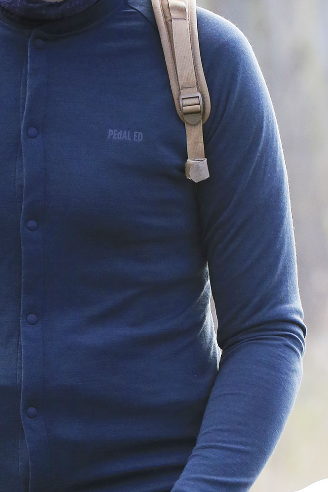 De Jary longsleeve is ook een bijzonder geval. Aan de voorkant dicht te maken met drukknoopjes. Gemaakt van 29% wol, 46% Polyester en 25% polyamide. Ontzettend comfortabel materiaal. Maar natuurlijk niet geschikt om zonder iets in onze winter te dragen. Daarom draag ik er een winddicht ondershirt onder. Met die combinatie blijk ik bij temperaturen van rond de 5 graden prima mijn rondjes te kunnen rijden. Het Jary longsleeve shirt zit niet strak, maar sluit wel mooi aan. Geen wapperende stoffen dus tijdens het fietsen. Aan de rechterzijkant zit een ritsje verstopt dat toegang geeft tot een zak. Echt veel kan daar niet in, maar daarvoor hebben ze natuurlijk ook al die mooie backpacking tassen uitgevonden. En voor een Nederlands gravelritje hoef je trouwens ook niet echt veel mee te nemen. Ik heb onderweg vaak een spiegelreflexcamera mee, die stop ik liever in een rugzakje.