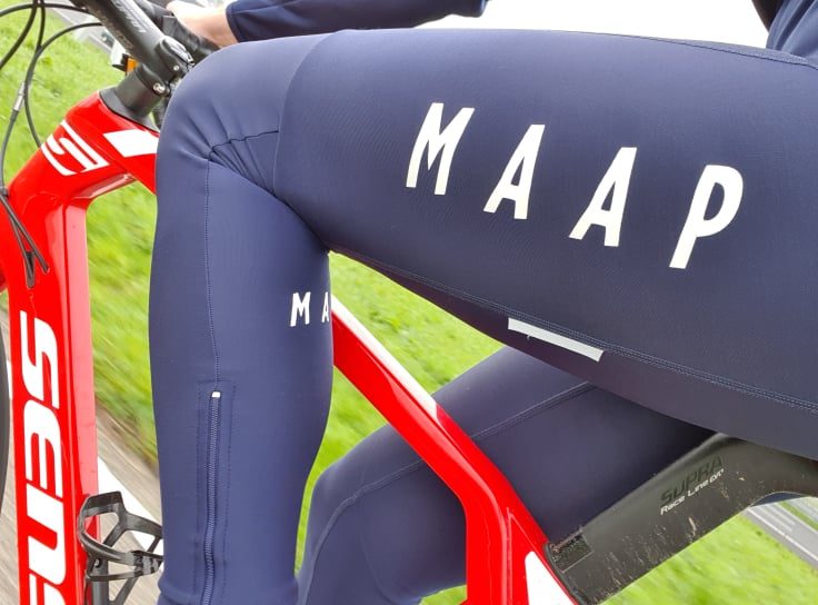 Een ritssluiting en reflectie. Oh, ja: na meerdere wasbeurten blijven ook de witte logo-stickers goed op hun plek zitten en zijn ze nog niet afgebrokkeld. Ook mooi meegenomen, want aangezien ‘MAAP’ best aanwezig is op de broek, wil je niet dat er een letter wegvalt..