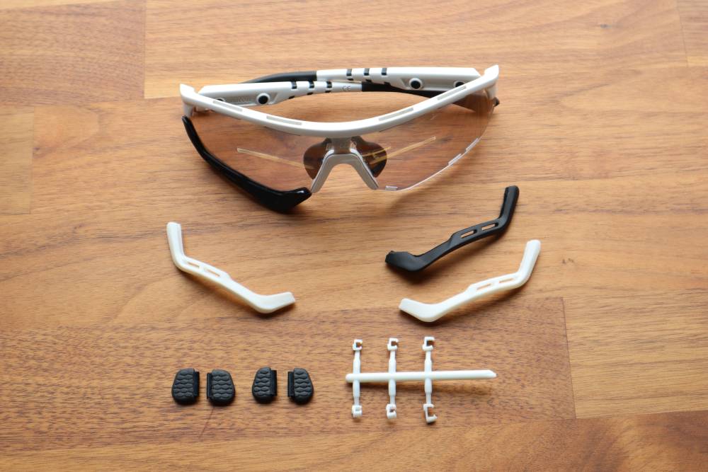 Het frame is erg robuust, het is ook geen superlicht brilletje. Maar 33 gram is prima, je voelt hem al snel niet meer zitten. In de doos verder nog een stevige bewaardoos, en een brillenzakje. Verder twee andere maten neusstukjes en witte ‘fenders’ plus 6 andere sierstukjes voor op de brilpoten. Die ‘fenders’ zijn de beschermrandjes aan de onderkant. Die zouden kunnen voorkomen dat de bril in je gezicht snijdt bij een onverhoopte val. Je kunt ze ook verwijderen, dat bespaart 2 gram, en geeft de bril gelijk een heel ander half-frame uiterlijk.