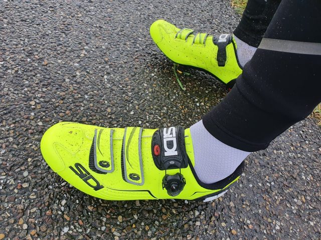 Boven verwachting goed! Om eerlijk te zijn had ik niet verwacht dat het zo’n fijne schoen zou zijn. Qua looks ziet de fluorgele schoen er ontzettend snel uit, maar qua gewicht had ik zo mijn bedenkingen. Onterecht, zo bleek na een paar testritjes, Al rijdend merk je namelijk weinig van het iets zwaardere gewicht (335 gram), wat verder geen naam mag hebben. Een van de belangrijkste onderdelen van een fietsschoen is de buitenzool. De zool van de Sidi Alba bestaat grotendeels uit Nylon en voor een klein deel uit ingespoten carbon. Meestal hangen de bedrijven een indexcijfertje aan de stijfheid van de zool (6 op 10, 7 op 14 o.i.d.), maar bij de Alba heeft Sidi dat niet gedaan. Meestal krijgt zo’n Nylonzool een 5/6 op schaal van 10, maar bij de Alba heb ik het idee dat de zool een stuk stijver is. Dat is positief, want daardoor kun je meer kracht op de pedalen kwijt.
