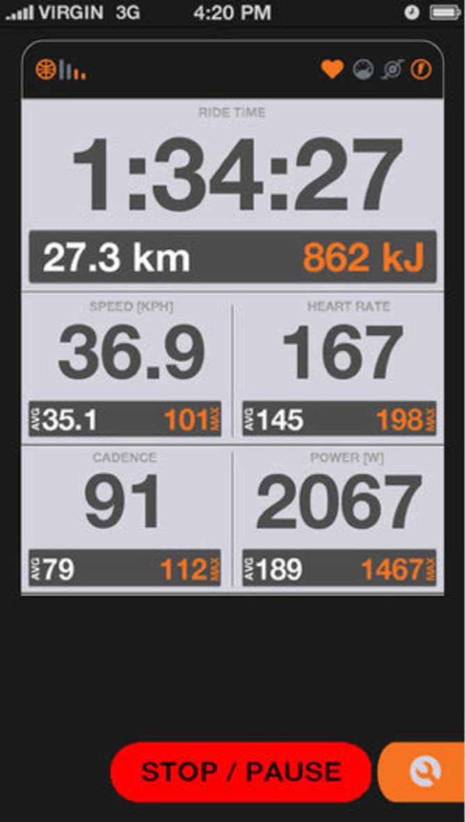 Op het display van de iPhone app kunnen meerdere waardes worden weergegeven: vermogen, snelheid (via de GPS van de telefoon of de sensor), hartslag, afstand en gereden tijd.