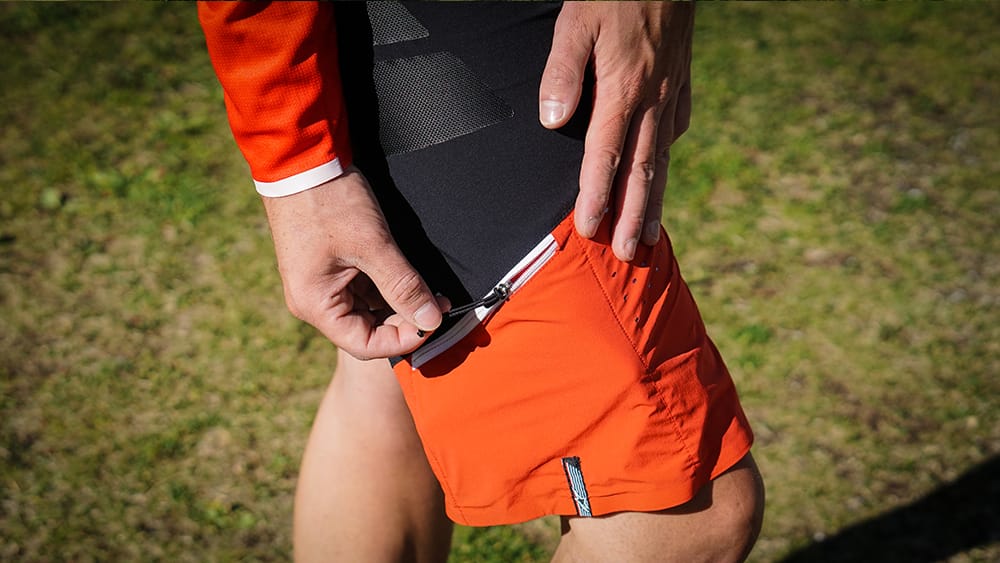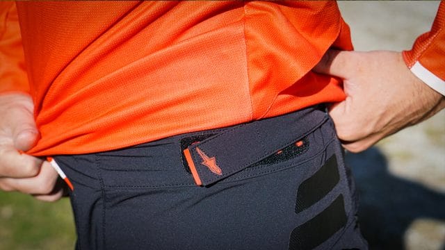 De broek sluit niet alleen qua kleuren perfect bij het Drop Pro shirt, ook dezelfde technieken zien we terug. Een hoge dubbele sluiting met rits en twee drukkers, twee klittenbandstrips aan de zijkant op heuphoogte om afzakken te voorkomen, verstevigde pads op de zijkanten en twee goed geplaatste zakken op de zijkant. Je kunt zo eenvoudig je telefoon of een reep meenemen. Aan de rechterkant zit ook nog een klein zakje voor wat los geld of iets dergelijks. De afwerking is zeer hoogwaardig met mooie materialen, nette stiksels en veel details. De Pro buitenbroek kan jaren mee. De binnenbroek (zonder bretels) heeft een redelijk eenvoudige zeem en is prima voor ritten van ongeveer twee uur in het zadel.