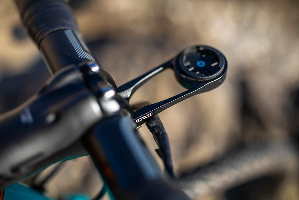 Een bijbehorende stuurpen mag niet ontbreken. 125 gram voor een variant van 100 millimeter. Normaliter moet je hiervoor een aluminium exemplaar kopen. De Enve stem is absoluut van carbon en daardoor ook wat meer oversized dan we gewend zijn. Het robuuste uiterlijk past wel bij het hele gravel gevoel. Enve maakt samen met K-Edge een bijbehorende computer mount die zeer prettig werkt en erg stabiel is. Kost je wel weer 70 piek extra. Het mag wat kosten allemaal.