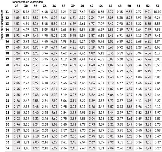 Wat nu als je een aandrijving wilt voor zowel op het vlakke als in de bergen? Laten we eerst eens naar het crankstel kijken, en dan met name het buitenblad. Fabrikanten gaan bij het samenstellen van crankstellen uit van vaste combinaties; een buitenblad met 50 tandjes is zo ontworpen dat hij precies past bij een binnenblad met 34 tandjes. Zelf een combi kiezen bij Shimano, SRAM en Campagnolo kan wel, maar is niet aan te raden omdat het ten koste gaat van de werking. En een haperend schakelapparaat is het laatste waar je tijdens een klim op zit te wachten. Waarom het buitenblad zo belangrijk is bij het kiezen van je verzet? Omdat vervangen duur is. Een buitenblad kost minimaal 100 euro, een binnenblad slechts twee tot drie tientjes. De reden: het buitenblad is gelakt en valt naadloos in de moderne spider met zijn 4-puntsaansluiting. Het binnenblad is een tamelijk sober tandwiel. Buitenbladen zijn er met 52, 50 en 46 tandjes. De laatste (in combinatie met een 36 binnenblad) is gemaakt voor de cyclocross, maar kan ook prima op de weg. Met een 46 voor en 11 achter haal je net zo veel meters per omwenteling (circa 8,70) als bij 50×12. Wil je sprinten als Cavendish of Groenewegen, dan moet je zo’n 10 meter per omwenteling kunnen draaien en is een groter buitenblad noodzakelijk.In het lichtste verzet leg je met een compact crankstel dezelfde afstand af als met een tripleOnze verzettentabel bevat een overzicht van de meest voorkomende tandwielcombinaties bij een racefiets met 28” wielen. Je vindt de rekenmodule op fiets.nl/verzettentabel.