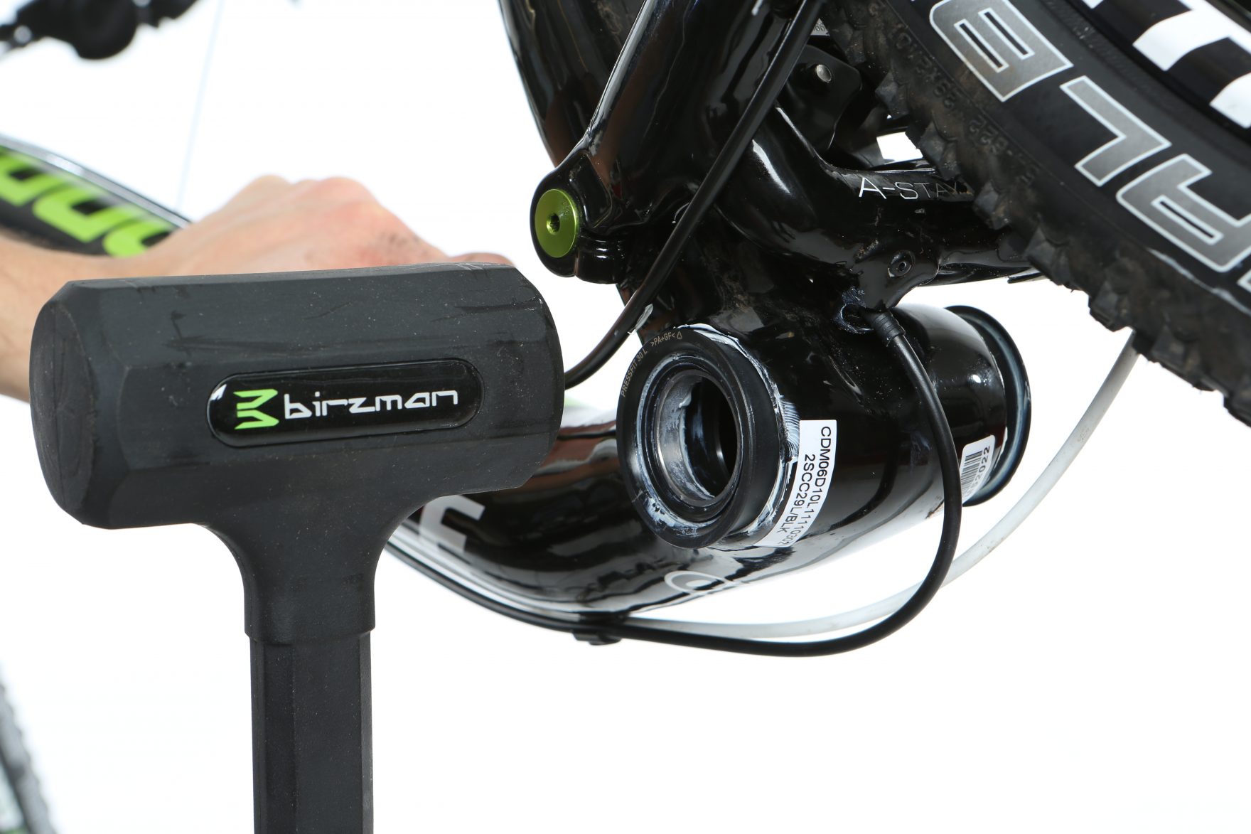 10. MeppenZonder pers kan je ook lagers monteren, al zullen we dat nooit aanraden aangezien de kans dat het misgaat groot is. Zeker een carbon frame zonder aluminium bus kan kapot gaan wanneer je een lager scheef in de zitting slaat. Doe je het toch op deze manier, controleer dan na iedere mep het resultaat. Tik rondom zodat het lager recht het frame ingaat. En gebruik een rubber hamer, liefst met anti-stuiter korrels zoals die van Birzman, daarmee kan je nauwkeurig doseren.