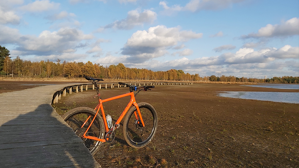 De Wi.De stond al een tijdje op mijn lijstje met ‘die-wil-ik’-fietsen. Dat is een erg lange lijst trouwens, maar wanneer je roept dat je een gravelfiets met MTB-banden maakt dan heb je me. Voor ik de Wi.De in meer traditionele vorm opbouw krijgt hij zijn doop in het veld met een recht stuur, grote schijven en natuurlijk de breedst mogelijke banden. Schwalbe G-One Speed in 2.35 uitvoering. De band die Kessler en Vroomen als uitgangspunt hebben gebruikt tijdens het ontwikkelen van dit frame. Tijdens de eerste rit vloog ik bijna alle bochten uit. Dat gebeurt me niet vaak. De fiets lijkt onbestuurbaar, terwijl het brede vlakke stuur juist voor zoveel controle zou moeten zorgen. De basis voor het probleem blijkt bij de banden te liggen. Daar komen we