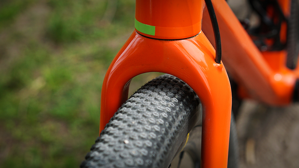 Het meest bijzondere aan de fiets is het feit dat je echte mountainbike banden kunt monteren in een frame dat geschikt is voor race crankstellen. Want, hoewel een voorderailleur niet op de spec-list staat is het geen probleem om een SRAM Red crank met 46 tands kettingwiel te monteren voor de snelle ritten.