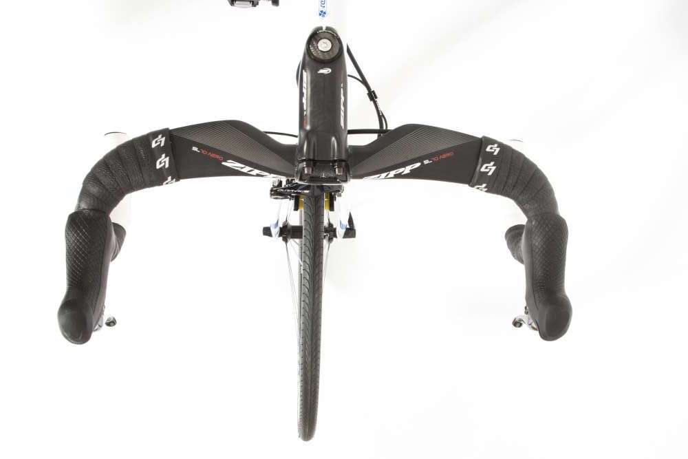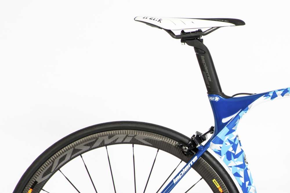 De fiets is bepaald niet doorsnee en lijkt op geen enkel ander merk. Het frame oogt sierlijk en snel. Ja, vooral snel. De gebogen lijnen vloeien mooi in elkaar over. De aero gevormde zitbuis valt gelijk op. Hij ziet er vet uit en ligt strak rond het achterwiel. De voorvork vormt zich mooi rond de direct mountrem en sluit ook perfect aan op het frame. Het slanke balhoofd is sierlijk en stoer tegelijk. Het is een coole fiets. Het zadelpenboutje is mooi afgedekt met een rubber kapje. De kabels lopen netjes door de buizen. De doorvoer voor de mechanische remmen is netjes afgedekt met rubber ‘dopjes’. De aero zadelpen heeft een flex punt voor iets meer comfort. Dit verraadt al dat we hier met een keiharde racer te maken hebben.