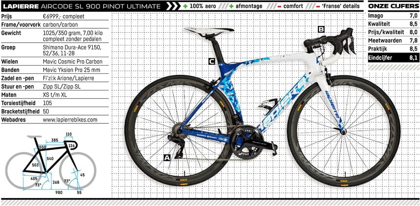 Het fietsenmerk Lapierre werd in 1946 opgericht in Dijon en groeide gestaag. In de jaren 80 maakte het naam met mountainbikes, vanaf 1996 concentreerde Lapierre zich meer en meer op wegfietsen. In mijn jaren als coureur heeft Lapierre nooit indruk op mij gemaakt. Ik dacht toentertijd zelfs dat het een soort supermarktmerk was. Dat imago is inmiddels wel wat opgepoetst. De fietsen zien er goed uit en mede door de topprestaties van Démare en Pinot heeft Lapierre aan uitstraling gewonnen. Het merk gebruikt de profploeg als testteam en zet de eigen onderzoek- en ontwikkelafdeling in om tot nieuwe producten te komen. Lapierre maakt onderdeel uit van de Nederlandse Accell Group (waartoe ook Koga en Batavus behoren), maar is nog steeds gevestigd in het Franse Dijon. Volgens kenners leert Koga overigens meer van Lapierre dan andersom, maar dit terzijde.THIBAUT PINOT-UITVOERING