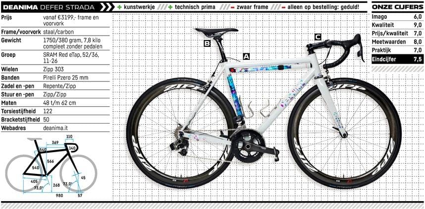 De stalen DeAnima DeFer is een speciale fiets. Een kunstwerkje waar je verliefd op moet worden om hem te willen hebben. Hij rijdt prima. Comfortabel maar toch met een racegevoel. Door zijn directe stuurgedrag voelt hij voor mij heel prettig aan. Hij heeft een goede loop en is tamelijk stijf. Wat je vaak ziet bij stalen fietsen is dat het gewicht aan de hoge kant is. Zelfs met lichte onderdelen komt hij ternauwernood onder de 8 kilo. Is dat erg? Voor de een wel en voor de ander niet. Soms helpt het ook om even in de spiegel te kijken en te zien of er bij jezelf nog wat af kan. Aan de andere kant geeft een lichte fiets ook een ander gevoel, wat soms ook prettig kan zijn.De prijs van de DeAnima is stevig, wat het een exclusieve fiets maakt. Je hebt dan ook een bijzondere fiets en een echte fiets uit de handen van een Pegoretti. Nu Dario niet meer onder ons is het enige en misschien wel beste alternatief. De fiets gaat terug naar Zwolle, waar dit kunstwerkje voorlopig nog wel te bewonderen is.