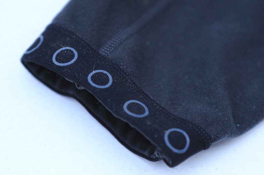 Vulpine geeft aan juist bewust geen rits te gebruiken om het risico op irritatie te voorkomen. Aan de zijkanten van het bovenbeen zit een subtiel zwart-op-zwart logo, met de letters HOY (Van Sir Chris, wie hem niet kent…shame on you!) en de V van Vulpine. Op de rechterkuit hetzelfde logo in een reflecterende uitvoering.- Hoy Vulpine Roubiax voorkant