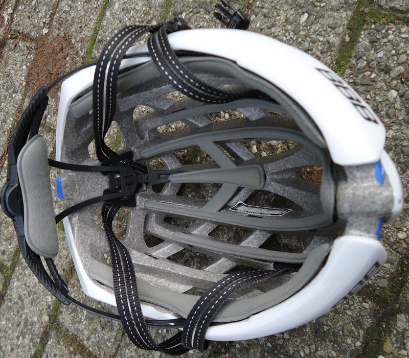 De Icarus is er in twee maten. M en L. En in zwart/wit, metallic zwart/neon geel, wit/blauw, wit/rood en mat wit/ zilver. Een maatje M weegt 280 gram. De Icarus is voorzien van een geïntegreerd verstelsysteem voor een goede pasvorm. Met een draaiknop ‘span’ je de helm als het ware op zodat deze prima blijft zitten. De bandjes zijn van dun materiaal gemaakt –iets wat je steeds meer bij tophelmen ziet. ‘Overall’ is de helm zeer netjes gemaakt.