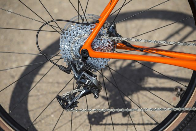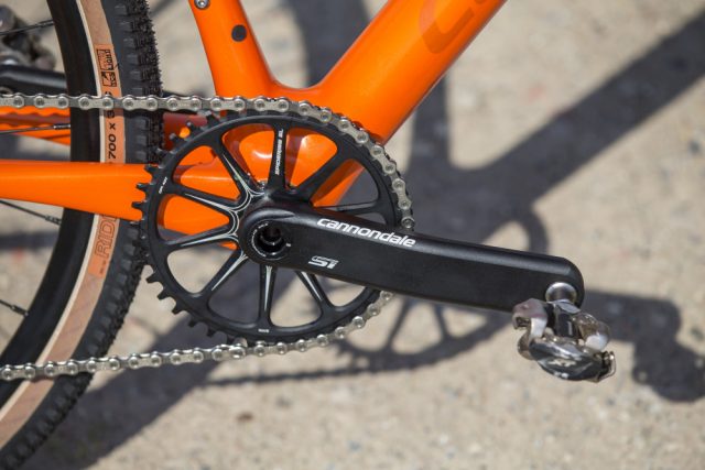 Beter dan de originele SuperX met velgremmen. Dus uiteraard schijfremmen! Met 12 millimeter steekassen, flat mount-remmen, binnendoor – nu wel – lopende kabels, 25,4 millimeter zadelpen en een eigen wielset. Daarnaast is de geometrie aangepakt: er is meer aandacht gekomen voor de rechtdoor stabiliteit. Het frame en de voorvork zijn licht en qua torsiestijfheid scoort de SuperX uitstekend. En deze S(pecial)E(dition)? Cannondale erkent ook dat het merk dan wel heel goed is in het maken van een cyclocross frame, het cyclocrossen zélf is een relatief kleine markt. Echter, het frame is zó goed dat de makeover van een 100 procent crosser naar een gravelracer geen al te grote opgave zou moeten zijn. De afmontage is uiteraard in orde: 11-speed SRAM Force 1, Hollowgram Si-crankstel en hydraulische SRAM-remmen. En heerlijk diep oranje lak met zwarte en zilveren details.Van crosser naar gravelracer