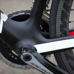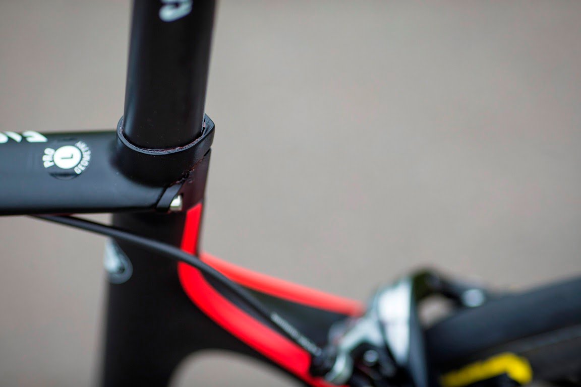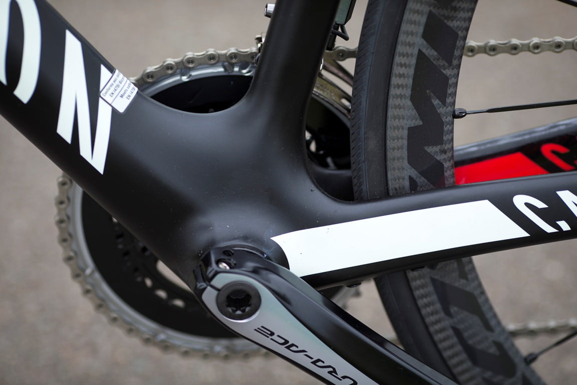 Alweer bijna vier jaar ‘jong’: de Canyon Aeroad CF. En sinds dat Katusha overstapte van Focus op Canyon – in 2012- is de Aeroroad de favoriet gebleken van veel renners. Canyon zette de Aeroad CF toen neer als een ‘breakaway bike’. Zo eentje waarmee je zo snel mogelijk naar de finish snelt. Daartoe is vooral het frontale oppervlak aangepakt en zijn de overgangen tussen de verschillende delen van het frame zo gladjes mogelijk gemaakt. Je ziet dit in de ‘hourglass-shaped’ balhoofdbuis en de geprofileerde onder- en bovenbuis in combinatie met de slanke staande achtervorken, lekker oversized bracket met press-fit lagers. De kabels lopen door de framebuizen. De Aeroblade SL en zadelpen: beiden zijn instelbaar op meer of minder sprong (!) en zogenaamde setback: resp. 39 of 44 mm naloop en 15 tot 35mm –wat inhoudt dat de zithoek kan veranderen tussen 70, 6 en 73, 5 graden. De´Katusha´9.0 is afgemonteerd met Shimano Dura-Ace 9070 en Mavic Cosmic wielset.