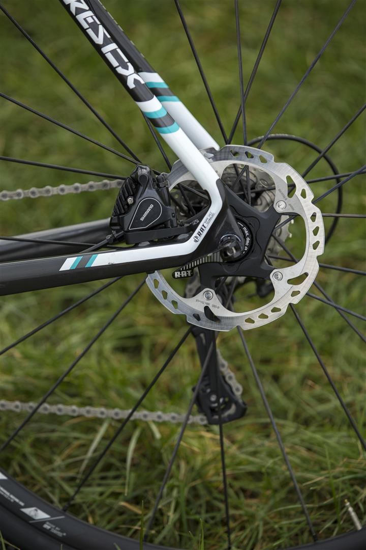 De geometrie is gewoon netjes ‘cross’. 71 graden balhoofdhoek, 73,5 graden zithoek, wielbasis van 1018, achtervork van 42,5 cm, stack van 559 en reach 390. De Mares heeft het R(apid)A(xle)T(echnology) systeem: steekassen, maar dan uitgevoerd als ‘quick releases’. Je steekt de 12 mm as door de naaf en klikt als het ware twee ‘pinnetjes’ vast; dan een draai en vast. Het vereist wat oefening, maar dan zitten de wielen gewoon goed vast. Ehhh… wij hebben eigenlijk liever gewoon simpele steekassen; van die modellen die je gewoon aandraait…. .