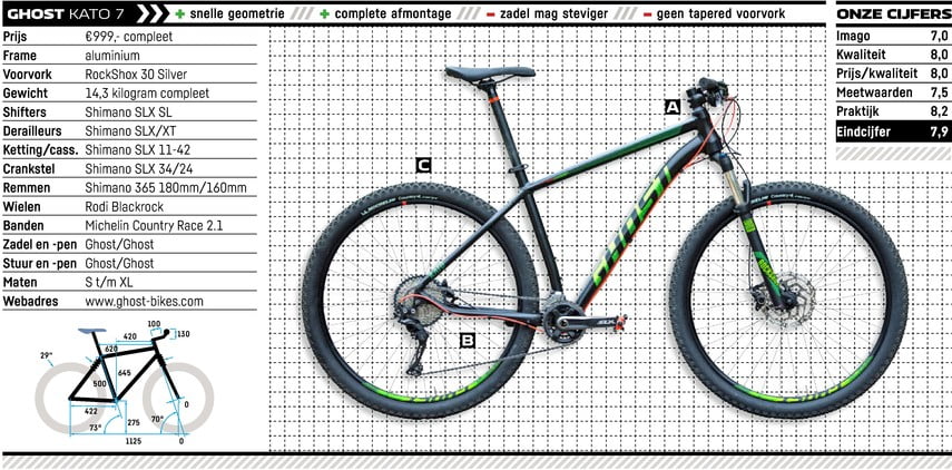 De Ghost Kato 7 is de zwaarste fiets uit de mtb-test van Fiets nr.10-2017. Toch geeft de vlotte geometrie met de lange bovenbuis en steile balhoofdhoek de fiets een snel karakter. Het liefst wil je er alleen maar mee vlammen. Het frame is mooi afgewerkt, met een lage liggende achtervork die klapperen van de ketting moet voorkomen. Het dikke tapered balhoofd had voor extra stabiliteit kunnen zorgen, maar dan moet je wel een tapered voorvork monteren. Een missertje.